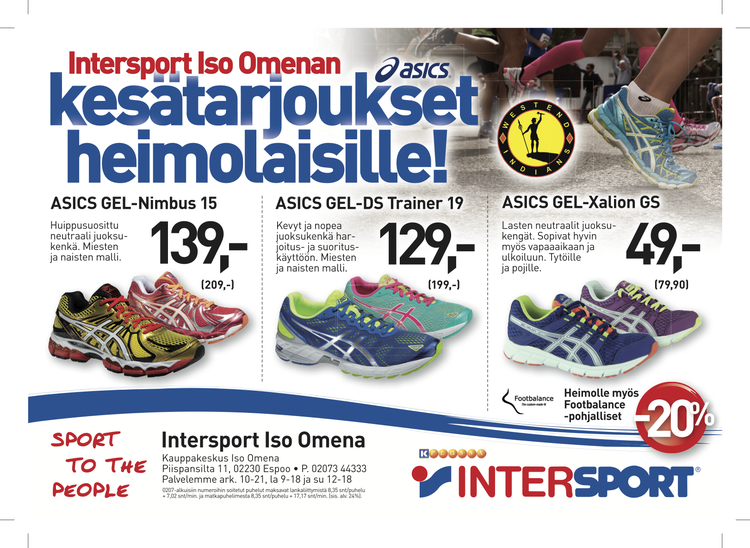 Aurinkoisen kevään kunniaksi Heimon virallinen urheilukauppa Intersport Iso Omena tarjoaa kaikille Heimolaisille kunnon Asics-juoksujalkineet huippuedullisesti! Valmistaudu kesäharjoitteluun hankkimalla oikeanlaiset jalkineet ammatilaisten opastamana.